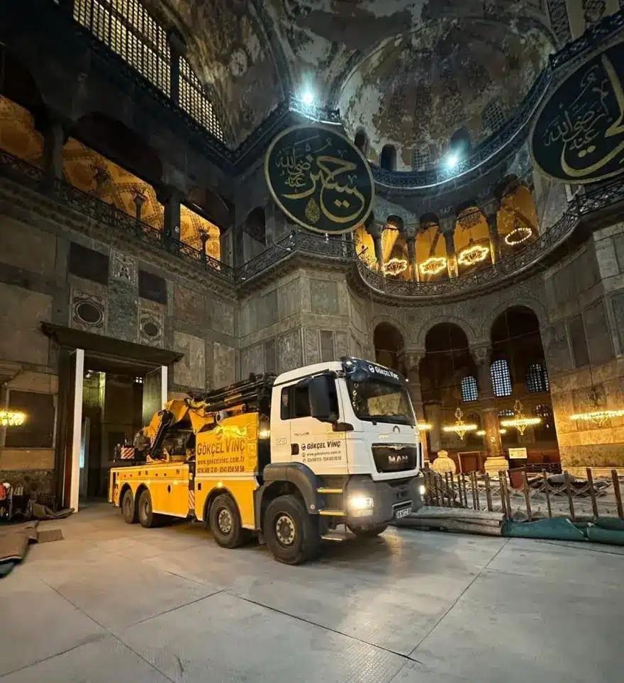 Ανησυχία έχει προκαλέσει η εικόνα ενός γερανοφόρου φορτηγού στο εσωτερικό της Αγίας Σοφίας, καθώς φωτογραφίες δείχνουν το όχημα να βρίσκεται στο δάπεδο του ναού, σταθμευμένο σε προσωρινές προστατευτικές πλάκες, καθώς και ένα όχημα κοντά στη λεγόμενη Αυτοκρατορική Πύλη, την κύρια τελετουργική είσοδο του μνημείου.
