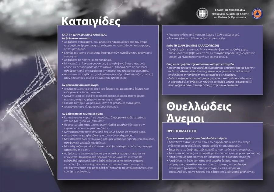 Παράλληλα, η γενική γραμματεία Πολιτικής Προστασίας συνιστά στους πολίτες να είναι ιδιαίτερα προσεκτικοί, μεριμνώντας για τη λήψη μέτρων αυτοπροστασίας από κινδύνους που προέρχονται από την εκδήλωση των έντονων καιρικών φαινομένων.