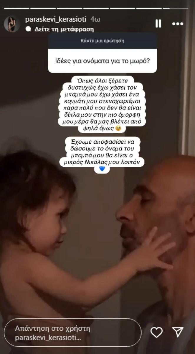 Όπως αποκάλυψε η ίδια σε πρόσφατο Q&A στο Instagram, το μωρό θα πάρει το όνομα του πατέρα της, που έχει φύγει από τη ζωή: «Όπως όλοι ξέρετε, έχω χάσει τον μπαμπά μου, έχω χάσει ένα κομμάτι μου, στενοχωριέμαι πάρα πολύ που δεν θα είναι δίπλα μου στην πιο όμορφή μου μέρα. Θα μας βλέπει από ψηλά όμως. Έχουμε αποφασίσει να δώσουμε το όνομα του μπαμπά μου, θα είναι ο μικρός Νικόλας μου λοιπόν».