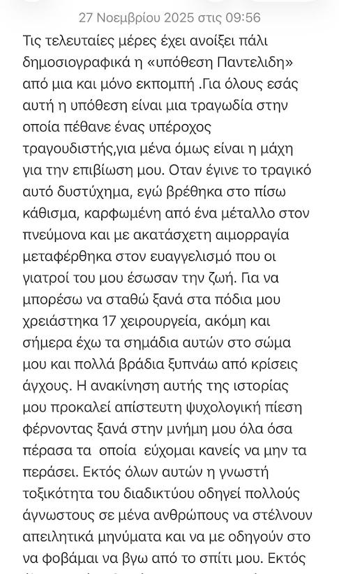 «Τις τελευταίες μέρες έχει ανοίξει πάλι δημοσιογραφικά η “υπόθεση Παντελίδη” από μια και μόνο εκπομπή. Για όλους εσάς αυτή η υπόθεση είναι μια τραγωδία στην οποία πέθανε ένας υπέροχος τραγουδιστής, για μένα όμως είναι η μάχη για την επιβίωσή μου. Όταν έγινε το τραγικό αυτό δυστύχημα, εγώ βρέθηκα στο πίσω κάθισμα, καρφωμένη από ένα μέταλλο στον πνεύμονα και με ακατάσχετη αιμορραγία. Μεταφέρθηκα στον Ευαγγελισμό, όπου οι γιατροί του μου έσωσαν τη ζωή. Για να μπορέσω να σταθώ ξανά στα πόδια μου χρειάστηκα 17 χειρουργεία. Ακόμη και σήμερα έχω τα σημάδια αυτών στο σώμα μου και πολλά βράδια ξυπνάω από κρίσεις άγχους.