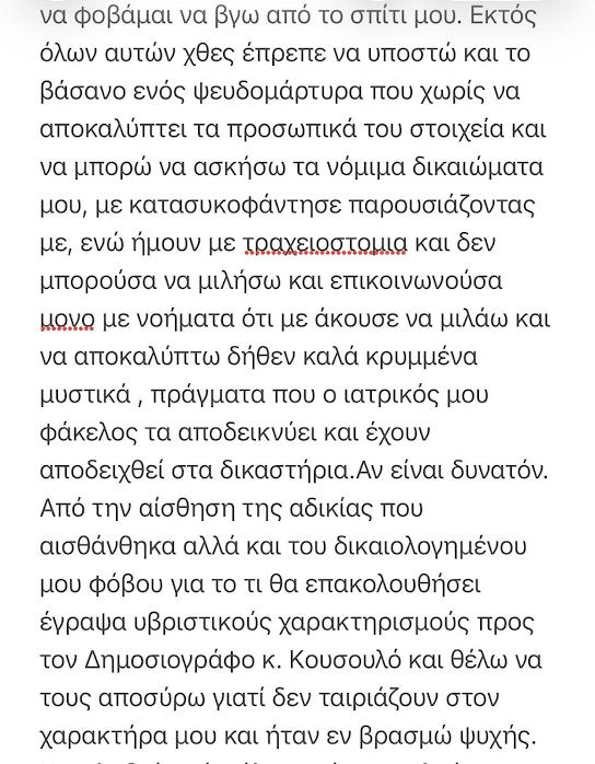 Από την αίσθηση της αδικίας που αισθάνθηκα, αλλά και του δικαιολογημένου μου φόβου για το τι θα επακολουθήσει, έγραψα υβριστικούς χαρακτηρισμούς προς τον δημοσιογράφο κ. Κουσουλό και θέλω να τους αποσύρω, γιατί δεν ταιριάζουν στον χαρακτήρα μου και ήταν εν βρασμώ ψυχής».