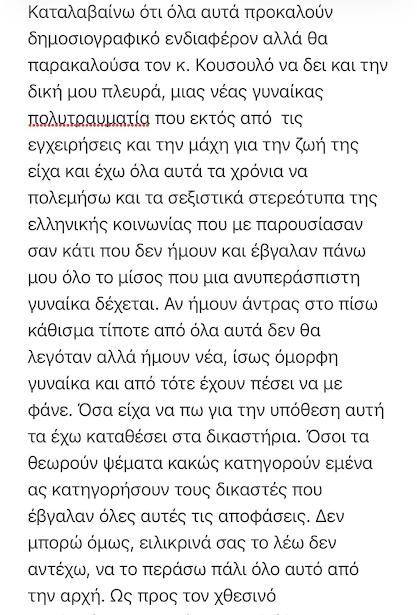 Ως προς δε τα ερωτήματα που συνεχώς μου θέτει ο κ. Κουσουλός, με σεβασμό τού λέω: έχουν όλα απαντηθεί στα δικαστήρια και αν θέλει ας κατηγορήσει τους δικαστές, όχι εμένα. Δεν θα συμμετέχω άλλο σε αυτόν τον δημόσιο διάλογο. Απλά, εάν πάλι διαπομπευθώ, θα αναγκαστώ να απευθυνθώ στις αρμόδιες αρχές, ΕΣΡ και Αστυνομία, για την προστασία όχι μόνο της τιμής και της υπόληψής μου, αλλά της ίδιας μου της ζωής, η οποία πάλι τίθεται σε κίνδυνο για λόγους τηλεθέασης και σεξισμού.