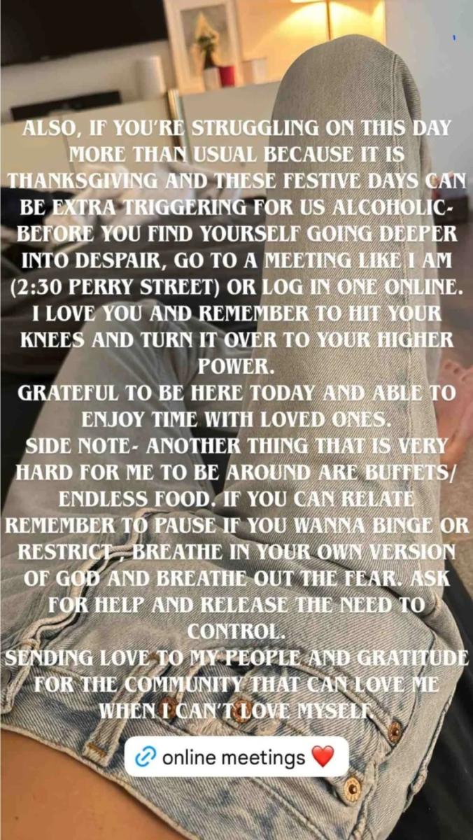 Στην ανάρτησή της παραδέχτηκε ότι ακόμη και σήμερα, μετά από 17 χρόνια νηφαλιότητας, συνεχίζει συναντήσεις με ανθρώπους που βρίσκονται στον ίδιο δρόμο, είτε δια ζώσης είτε διαδικτυακά.