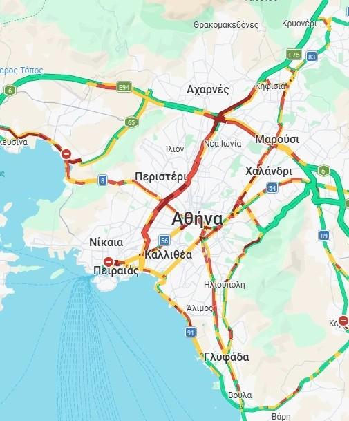 Προβλήματα εντοπίζονται στην Αθηνών-Κορίνθου στην Ελευσίνα, ενώ με αργές ταχύτητες κινούνται τα οχήματα στην Κηφισίας, τη Μεσογείων, τη Βουλιαγμένης και την Ποσειδώνος.