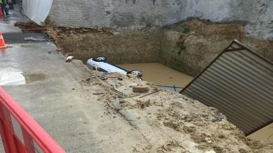 Επιβατικό αυτοκίνητο που ήταν σταθμευμένο στην άκρη οικοπέδου στο οποίο είχε γίνει εκσκαφή για την ανέγερση οικοδομής, βρέθηκε στο κενό, όταν λόγω της παρατεταμένης βροχόπτωσης υποχώρησε μέρος του οδοστρώματος.