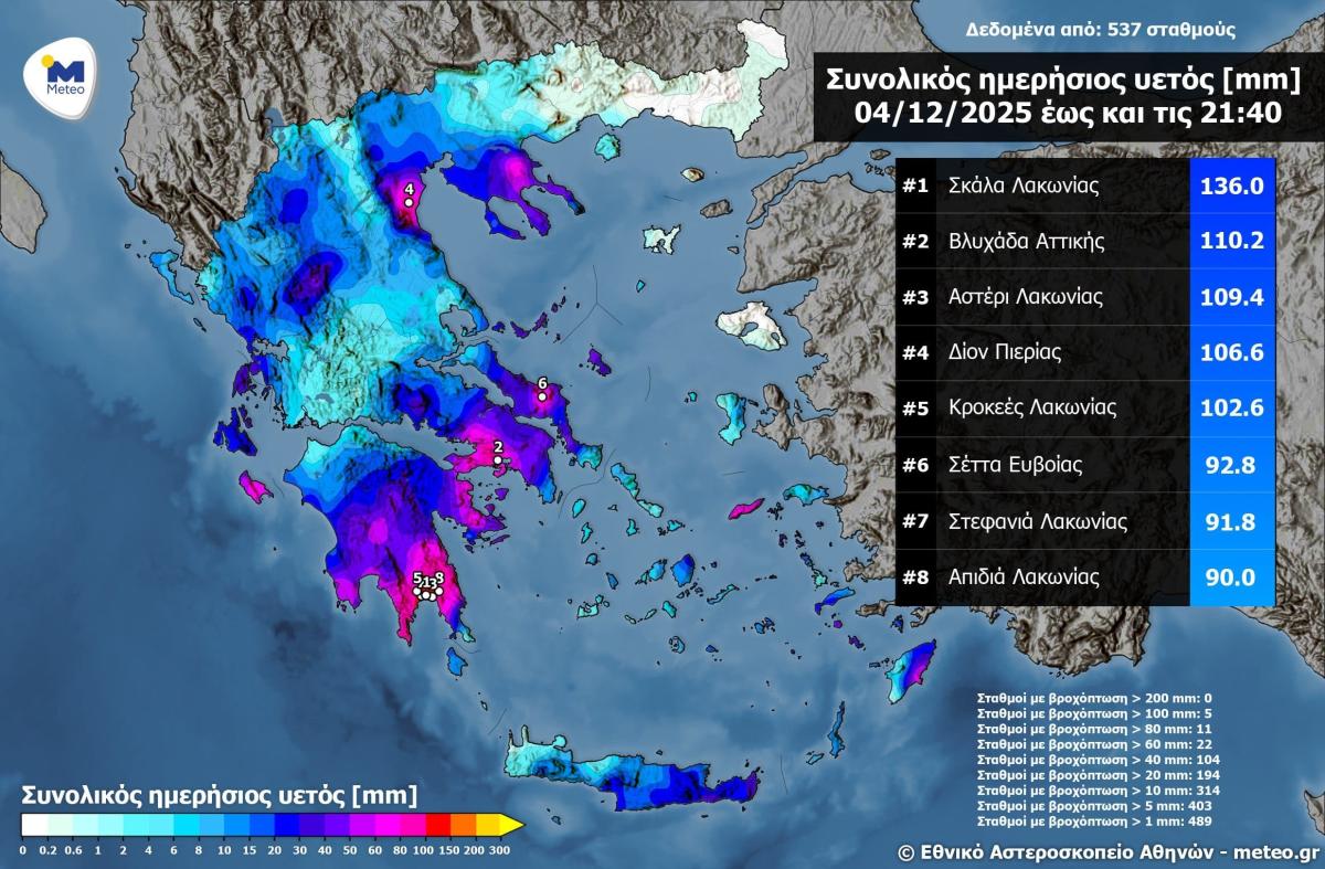 Ειδικότερα, στη Βλυχάδα Αττικής καταγράφηκαν 110.2 χιλιοστά βροχής μέχρι τις 21.40. Οι μετεωρολόγοι, την ίδια ώρα, προειδοποιούν για έντονα καιρικά φαινόμενα και το βράδυ της Πέμπτης.