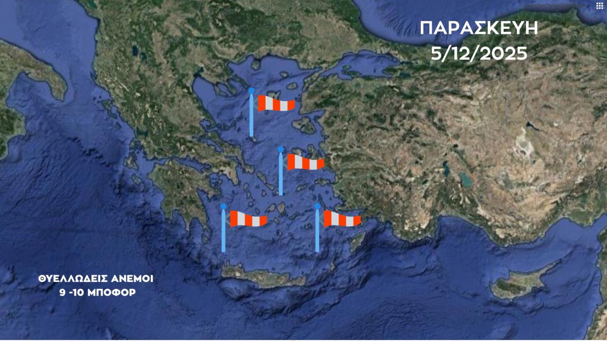 – Παραλλήλα σήμερα φυσούν θυελλωδείς άνεμοι στο Αιγαίο οι οποίοι τοπικά θα φτάσουν και τα 9-10 μποφόρ.