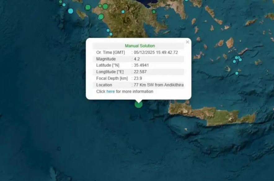 Σεισμός μεγέθους 4,2 βαθμών της κλίμακας Ρίχτερ σημειώθηκε στη θαλάσσια περιοχή ανάμεσα στη δυτική Κρήτη και τα Αντικύθηρα το απόγευμα της Παρασκευής (05.12.2025).
