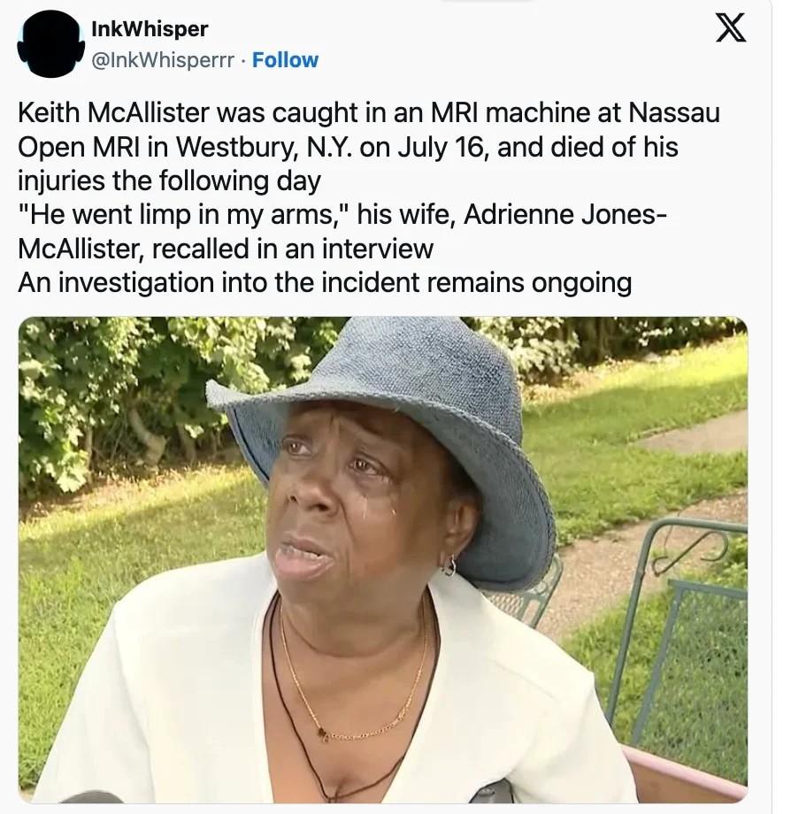 Η σύζυγός του, Αντριέν Τζόουνς-Μακάλιστερ, δήλωσε ότι ο σύζυγός της, ο 61χρονος Κιθ, φορούσε στο λαιμό του μια μεταλλική αλυσίδα βάρους 9 κιλών, που χρησιμοποιείται για προπόνηση και απώλεια βάρους.
