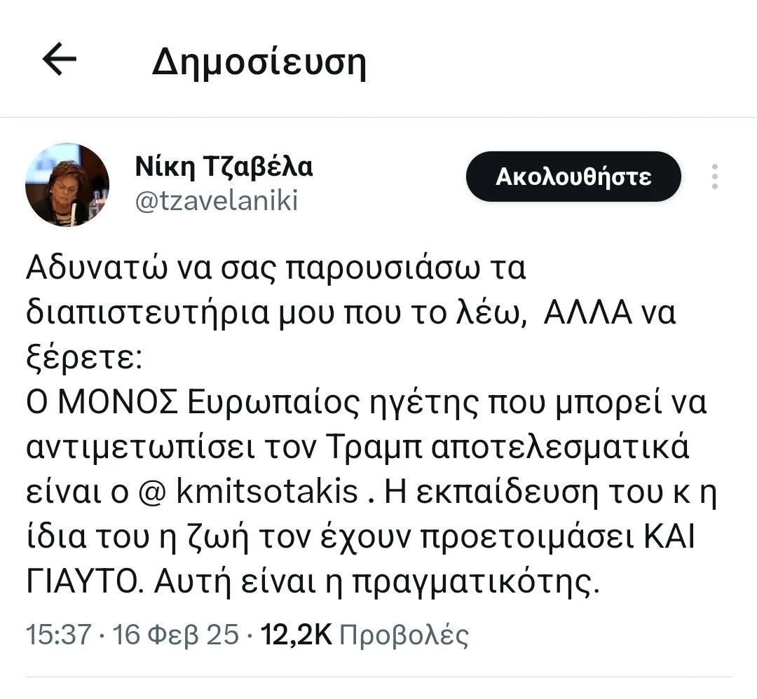 “Αδυνατώ να σας παρουσιάσω τα διαπιστευτήρια μου που το λέω, ΑΛΛΑ να ξέρετε: Ο ΜΟΝΟΣ Ευρωπαίος ηγέτης που μπορεί να αντιμετωπίσει τον Τραμπ αποτελεσματικά είναι ο Κυριάκος Μητσοτάκης. Η εκπαίδευση του και η ίδια του η ζωή τον έχουν προετοιμάσει ΚΑΙ ΓΙΑΥΤΟ. Αυτή είναι η πραγματικότης”.