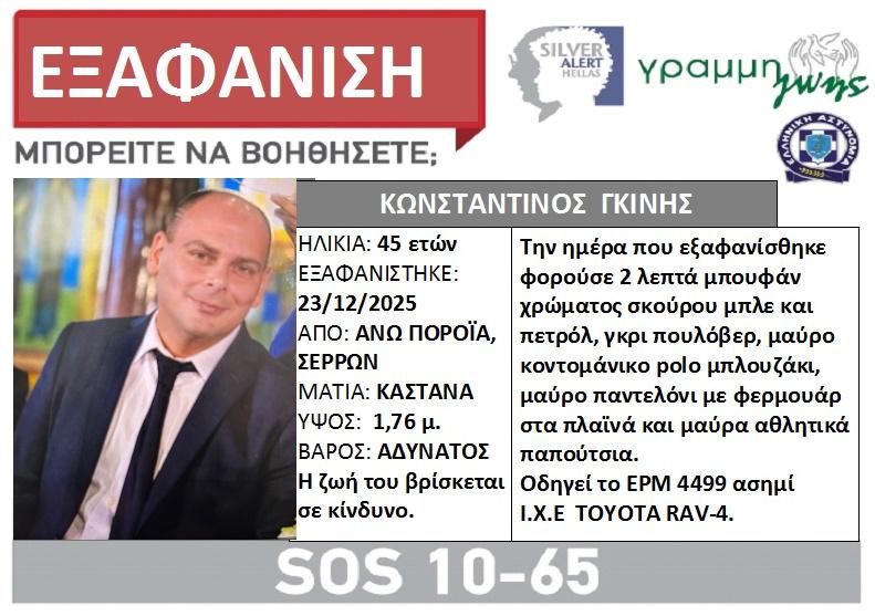 Η εξαφάνιση του διοικητή του Πυροσβεστικού Κλιμακίου Πορροΐων, Κωνσταντίνου Γκίνη, έχει σημάνει συναγερμό στον νομό Σερρών. Από το πρωί της Δευτέρας 23 Δεκεμβρίου 2025, οι τοπικές αρχές αναζητούν τον 45χρονο, μετά τη δήλωση εξαφάνισης που υπέβαλε η σύζυγός του στο Αστυνομικό Τμήμα Πορροΐων. Η ίδια ενημέρωσε ότι πέρασε χρονικό διάστημα άνω των 24 ωρών χωρίς καμία επικοινωνία, ενώ ο αγνοούμενος δεν εμφανίστηκε ούτε στην υπηρεσία του, παρότι δεν βρισκόταν σε ενεργή βάρδια. Το στοιχείο αυτό ενίσχυσε την ανησυχία, καθώς ο 45χρονος διατηρούσε σταθερή επαφή με το εργασιακό του περιβάλλον.