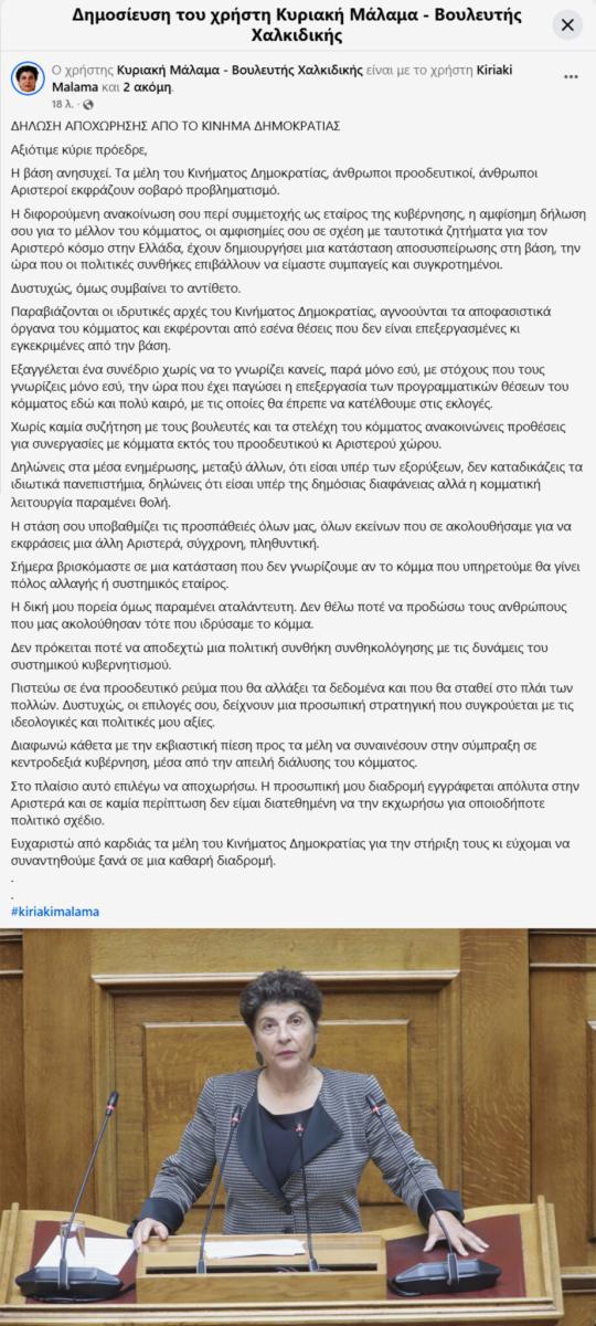 Η ίδια γνωστοποίησε μέσω ανάρτησης στον προσωπικό της λογαριασμό στο Χ την αποχώρησή της από το κόμμα του Στέφανου Κασσελάκη, κάνοντας λόγο για «παραβιάσεις των ιδρυτικών αρχών του Κινήματος Δημοκρατίας» και καταγγέλλοντας ότι αγνοούνται τα αποφασιστικά όργανα του κόμματος. Η εξέλιξη αυτή εντάσσεται σε ένα γενικότερο κλίμα κινητικότητας, καθώς το 2026 διαμορφώνεται ήδη ως έτος έντονου εκλογικού σχεδιασμού για αρκετούς βουλευτές, κυρίως από τον χώρο της Αριστεράς.
