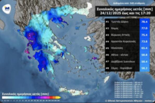 Σύμφωνα με το δίκτυο αυτόματων μετεωρολογικών σταθμών του Εθνικού Αστεροσκοπείου Αθηνών / Meteo.gr μεγάλα ύψη βροχής καταγράφηκαν στα δυτικά ηπειρωτικά και στην Αττική, με το μεγαλύτερο ύψος βροχής μέχρι και τις 17:20 ώρα Ελλάδας να καταγράφεται στη Δάφνη Αττικής με 78 mm.
