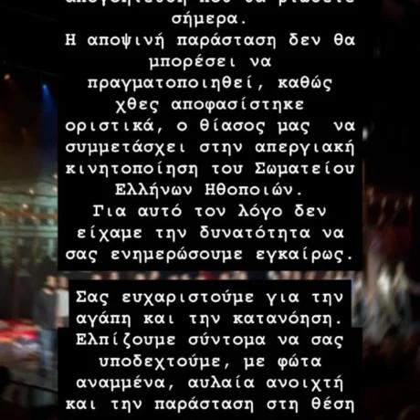 «Αγαπημένοι μας φίλοι, Ζητάμε ειλικρινά συγγνώμη για την αναστάτωση και την απογοήτευση που θα βιώσετε σήμερα. Η αποψινή παράσταση δεν θα μπορέσει να πραγματοποιηθεί, καθώς χθες αποφασίστηκε οριστικά, ο θίασος μας να συμμετάσχει στην απεργιακα κινητοποίηση του Σωματείου Ελλήνων Ηθοποιών. Για αυτό τον λόγο δεν είχαμε την δυνατότητα να σας ενημερώσουμε εγκαίρως. Σας ευχαριστούμε για την αγάπη και την κατανόηση. Ελπίζουμε σύντομα να σας υποδεχτούμε, με φώτα αναμμένα, αυλαία ανοιχτή και την παράσταση στη θέση της. Με εκτίμηση και σεβασμό Ελεονόρα» έγραψε χαρακτηριστικά η Ελεονώρα Ζουγανέλη μέσω story στα social media.