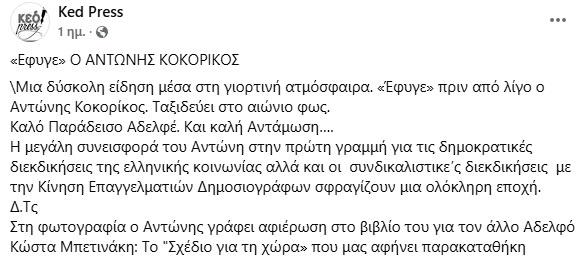 «Μια δύσκολη είδηση μέσα στη γιορτινή ατμόσφαιρα. “Έφυγε” πριν από λίγο ο Αντώνης Κοκορίκος. Ταξιδεύει στο αιώνιο φως.