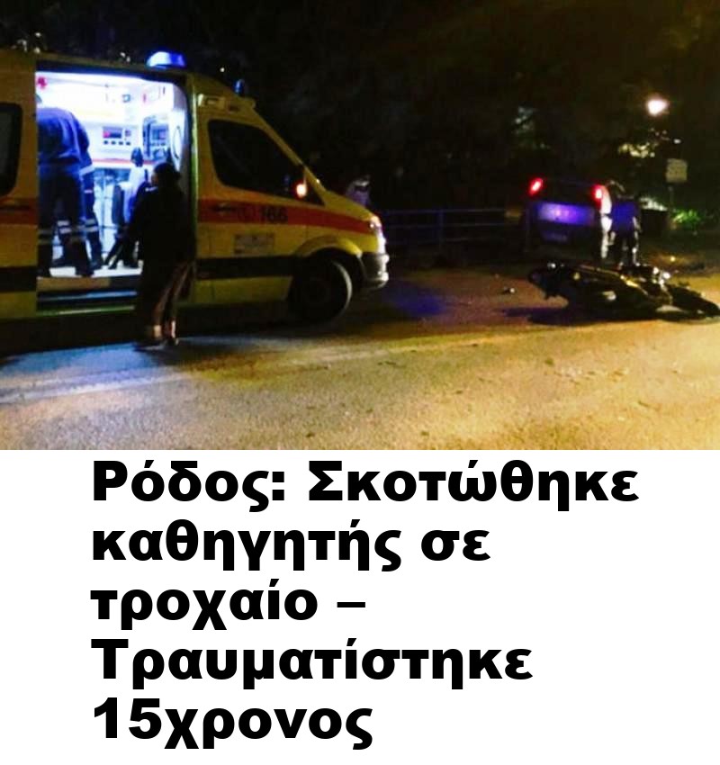 Τραγωδία στη Ρόδο, όπου ένας καθηγητής σκοτώθηκε όταν το δίκυκλο που οδηγούσε ξέφυγε της πορείας του και προσέκρουσε σε κολώνα. Μαζί του επέβαινε και ένας 15χρονος, ο οποίος τραυματίστηκε ελαφρά.
