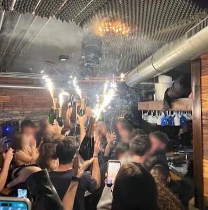 Νέοι άνθρωποι που διασκεδάζουν υψώνουν φιάλες σαμπάνιες. Επάνω στις φιάλες είναι προσαρμοσμένα τα “βεγγαλικά” που διαφημίζονται ως κατάλληλα για εσωτερικούς χώρους. Μόνο που πάνω από τους ανθρώπους που γιορτάζουν υπάρχει ένα χαμηλό ταβάνι επενδυμένο με εύφλεκτα, αφρώδη, υλικά.