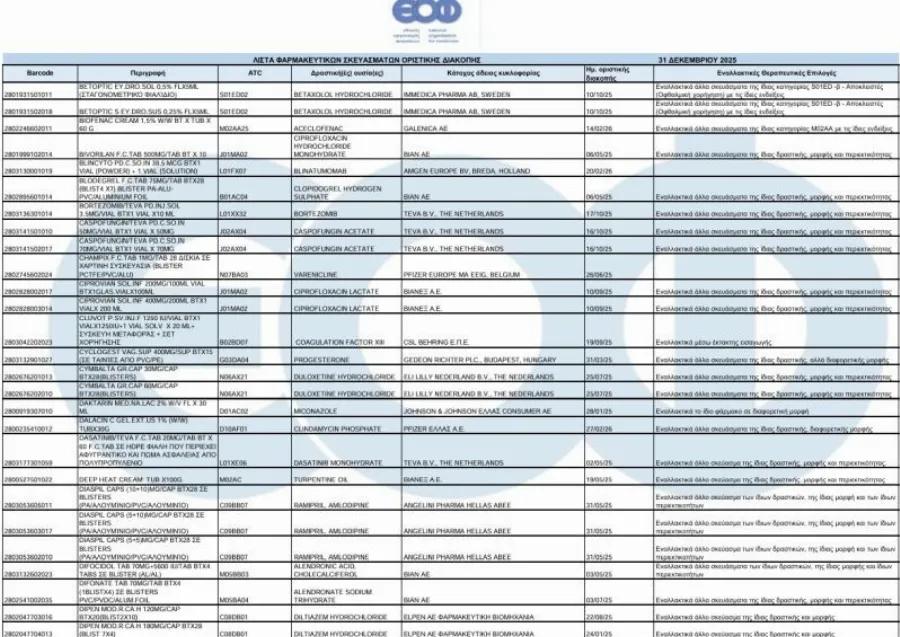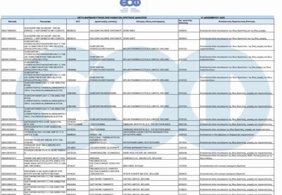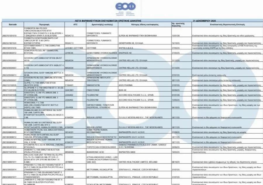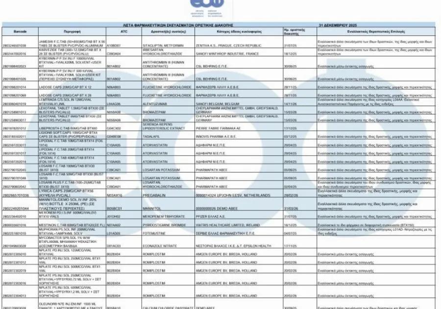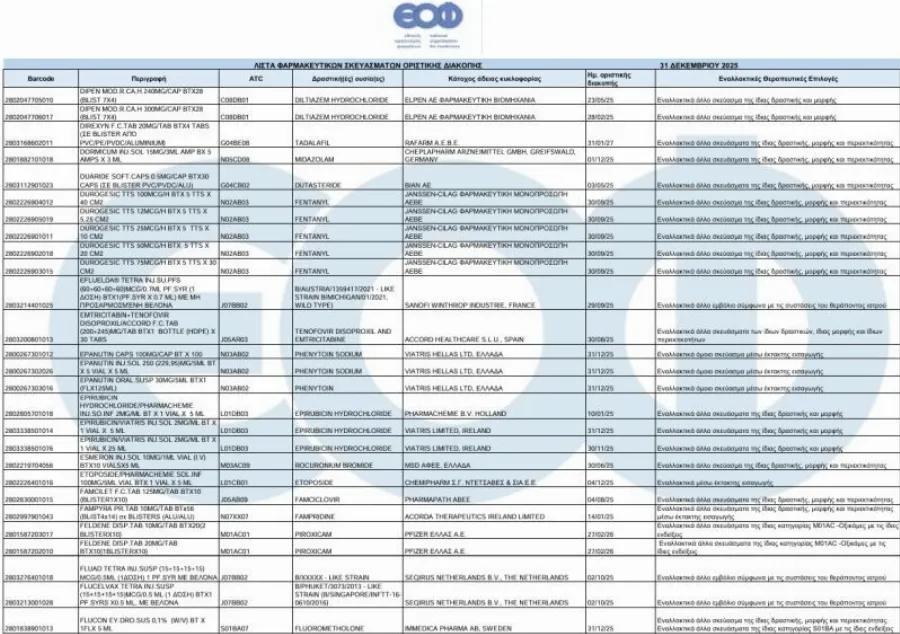 Τι αλλάζει για τους ασθενείς που τα παίρνουν – Ο κατάλογος του ΕΟΦ με τα εναλλακτικά φάρμακα