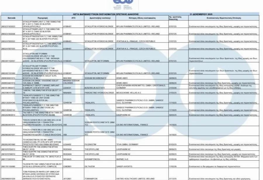 Όπως επισημαίνουν στελέχη του ΕΟΦ, η κάλυψη των ασθενών δεν αναμένεται να διαταραχθεί, καθώς για τα προϊόντα που αποσύρονται προβλέπεται χρήση εναλλακτικών σκευασμάτων με την ίδια δραστική ουσία, ίδια φαρμακοτεχνική μορφή, ίδια περιεκτικότητα και ίδια ένδειξη. Σε ειδικότερες περιπτώσεις, 23 από τα φάρμακα θα αντικατασταθούν μέσω έκτακτων εισαγωγών, ενώ για 2 σκευάσματα η κάλυψη θα γίνει με νεότερες θεραπευτικές επιλογές.