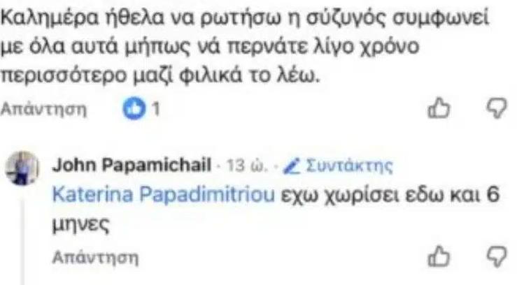 Πιο συγκεκριμένα, σε μια από τις αναρτήσεις του στο facebook μια γυναίκα έχει σχολιάσει, «Καλημέρα ήθελα να ρωτήσω, η σύζυγος συμφωνεί με όλα αυτά μήπως να περνάτε λίγο χρόνο περισσότερο μαζί; Φιλικά το λέω» με τον ίδιο να απαντά, «Έχω χωρίσει εδώ και έξι μήνες».