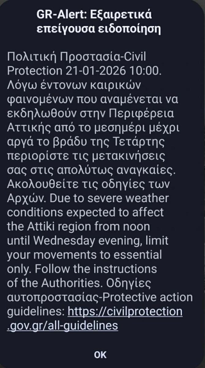 Μήνυμα του 112 εστάλη το πρωί της Τετάρτης 21 Ιανουαρίου στους κατοίκους της Βοιωτίας αλλά και της Εύβοιας, καλώντας τους να περιορίσουν τις μετακινήσεις τους, ενόψει της κακοκαιρίας αλλά και των έντονων καιρικών φαινομένων που αναμένεται να εκδηλωθούν.