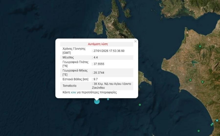 Σεισμική δόνηση 4,4 Ρίχτερ σημειώθηκε ανοιχτά της Ζακύνθου, το απόγευμα της Τρίτης (27/1).