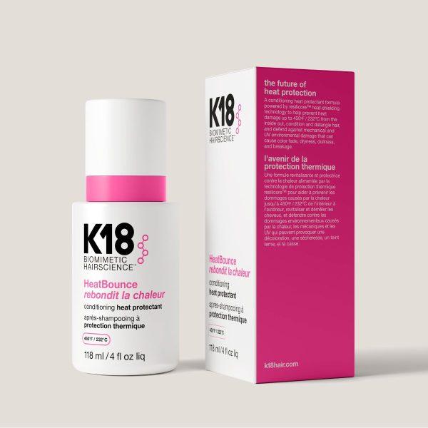 Τα ηλεκτρικά εργαλεία styling εκπέμπουν θερμότητα, η οποία καταστρέφει τη φυσική κερατίνη της τρίχας κάνοντας τα μαλλιά αδύναμα, με αποτέλεσμα να σπάνε εύκολα, να εμφανίζουν ψαλίδα και να μακραίνουν δύσκολα. Για αυτόν τον λόγο, είναι απαραίτητο χρησιμοποιείς πάντα θερμοπροστατευτικά προϊόντα ώστε να προστατέψεις την τρίχα σου. Δοκίμασε το K18 HeatBounce conditioning heat protectant 118ml, ένα μαλακτικό σπρέι που δεν ξεβγάζεται και βοηθάει στην θωράκιση της τρίχας ώστε να αποφεύγεται η φθορά από την θερμότητα μέχρι 232°C από μέσα προς τα έξω.