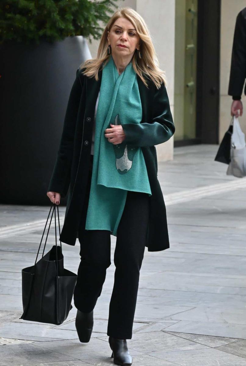 Αυτή τη φορά σε πρωινή της έξοδο στο κέντρο της Αθήνας επέλεξε να φορέσει κλασικό μαύρο παντελόνι σε ίσια γραμμή και λευκή μπλούζα τα οποία συνδύασε με ένα εντυπωσιακό δερμάτινο πανωφόρι, σε σκούρο πράσινο χρώμα, και ένα τιρκουάζ κασκόλ διακοσμημένο με στρας που την προστάτευε από το κρύο δίνοντας φως και ζωντάνια στο σύνολο της.