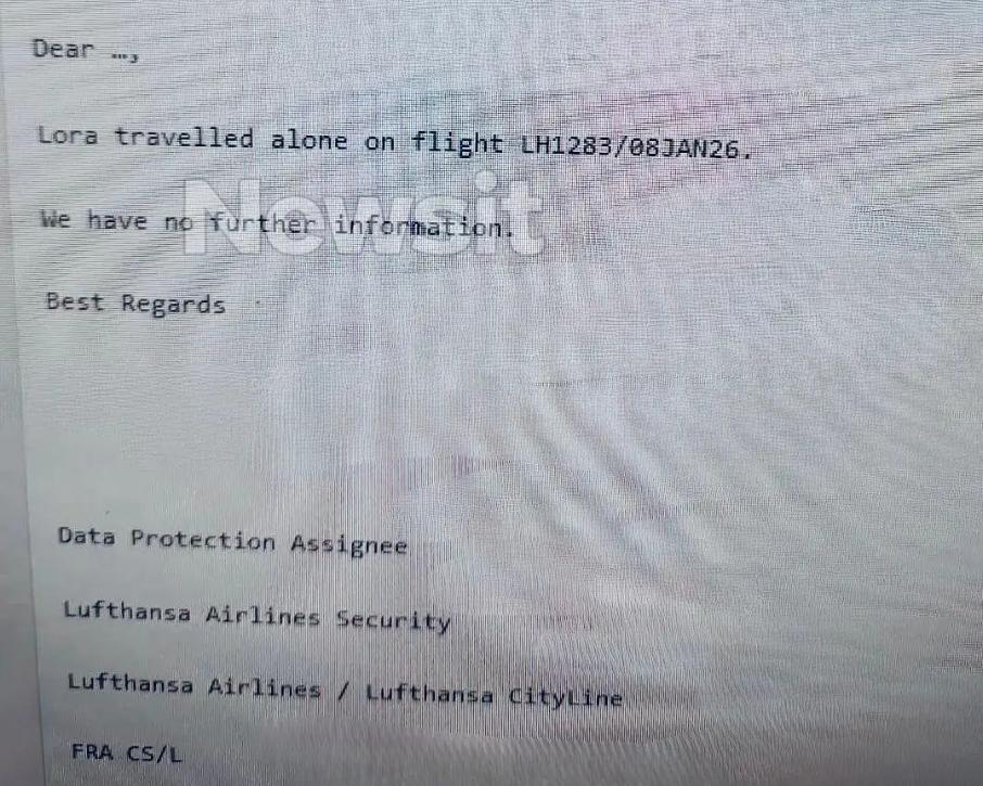 «Η Λόρα ταξίδεψε μόνη της με την πτήση LH1283 στις 8 Ιανουαρίου 2026. Δεν διαθέτουμε περαιτέρω πληροφορίες. Με εκτίμηση».