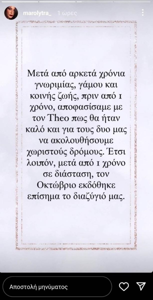 Δείτε αυτή τη δημοσίευση στο Instagram.Μετά από αρκετά χρόνια γνωριμίας, γάμου και κοινής ζωής, πριν από έναν χρόνο αποφασίσαμε με τον Theo πως θα ήταν καλό και για τους δυο μας να ακολουθήσουμε χωριστούς δρόμους. Έτσι λοιπόν μετά από έναν χρόνο σε διάσταση τον Οκτώβριο εκδόθηκε επίσημα το διαζύγιό μας.