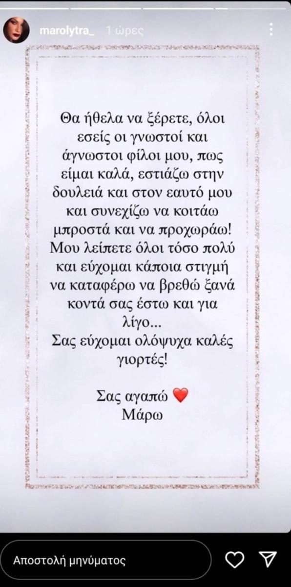 Θα ήθελα να ξέρετε όλοι, εσείς οι γνωστοί και οι άγνωστοι φίλοι μου, πως είμαι καλά εστιάζω στη δουλειά και τον εαυτό μου και συνεχίζω να κοιτάω μπροστά και να προχωράω. Μου λείπετε όλοι τόσο και εύχομαι κάποια στιγμή να καταφέρω να βρεθώ ξανά κοντά σας έστω και για λίγο. Σας εύχομαι ολόψυχα καλές γιορτές. Σας αγαπώ. Μάρω».