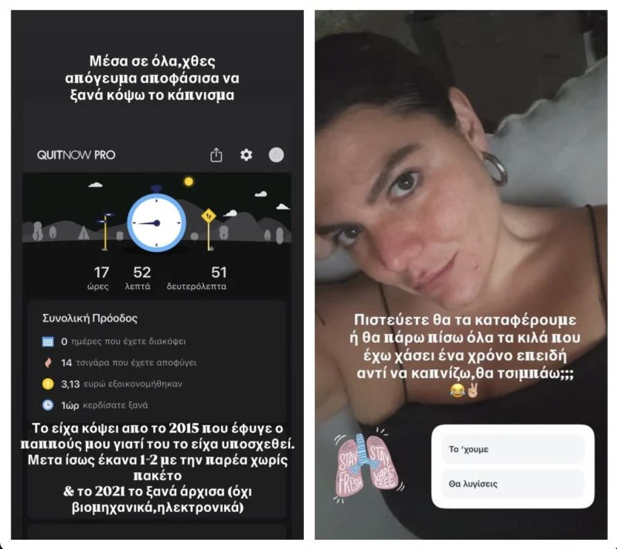 «Μέσα σε όλα, χθες απόγευμα αποφάσισα να ξανακόψω το κάπνισμα. Το είχα κόψει από το 2015, που έφυγε ο παππούς μου, γιατί του το είχα υποσχεθεί. Μετά ίσως έκανα 1-2 με την παρέα χωρίς πακέτο και το 2021 το ξανάρχισα (όχι βιομηχανικά, ηλεκτρονικά)», εξηγεί η Δανάη Μπάρκα στην ιστορία της.
