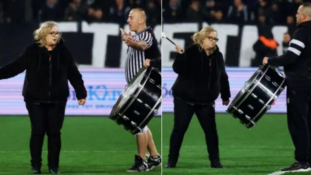Το βίντεο που κυκλοφόρησε στο TikTok από τον χρήστη paoktsis.gr και έγινε αμέσως viral, δείχνει τη γυναίκα να χτυπά το τύμπανο με δύναμη, ενώ γύρω της εκατοντάδες οπαδοί παρακολουθούσαν με δάκρυα στα μάτια και απόλυτη σιωπή, η οποία στη συνέχεια μετατράπηκε σε ένα ρυθμικό σύνθημα τιμής για το παιδί της.