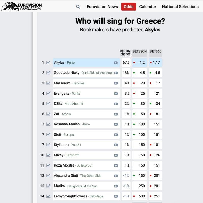 Ο πυρετός της Eurovision έχει ήδη αρχίσει να ανεβαίνει και τα πρώτα στοιχήματα για τον ελληνικό εθνικό τελικό δείχνουν ξεκάθαρο φαβορί. Το κοινό φαίνεται να έχει αποφασίσει από νωρίς: ο Akylas με το «Ferto» προηγείται με διαφορά, κατακτώντας την κορυφή των αποδόσεων και δημιουργώντας ένα εντυπωσιακό κύμα υποστήριξης γύρω από τη συμμετοχή του.