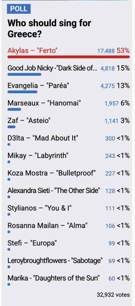 Τρίτη στα στοιχήματα είναι η συμμετοχή της Marseaux. Ο Akylas, όμως φαίνεται ότι προηγείται και στις προτιμήσεις του κοινού. Με διαδικτυακή ψηφοφορία με πάνω από 40 χιλιάδες ψήφους, το «Ferto» είναι το ξεκάθαρο φαβορί έναντι των άλλων ελληνικών συμμετοχών.