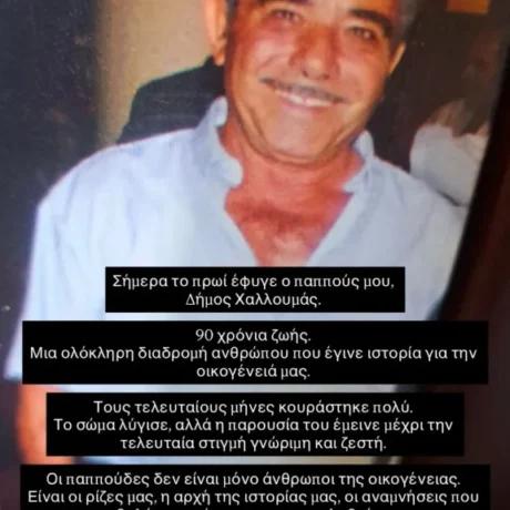 Όπως αποκάλυψε το πρωί της 23ης Φεβρουαρίου, ο αγαπημένος του παππούς, Δήμος Χαλλούμας, έφυγε από τη ζωή σε ηλικία 90 ετών.