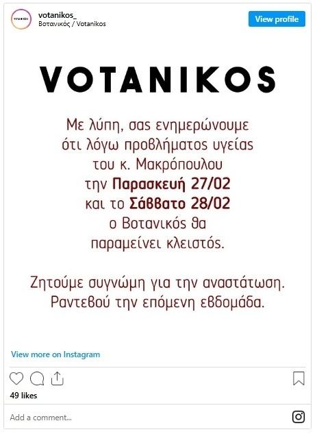 Στην ανάρτησή του, το νυχτερινό κέντρο αναφέρει: «Με λύπη, σας ενημερώνουμε ότι λόγω προβλήματος υγείας του κ. Μακρόπουλου την Παρασκευή 27/02 και το Σάββατο 28/02, ο Βοτανικός θα παραμείνει κλειστός». Με τη διατύπωση αυτή, η επιχείρηση επιβεβαιώνει ότι το πρόβλημα υγείας του καλλιτέχνη οδήγησε στο προσωρινό κλείσιμο του χώρου, χωρίς να δίνει περαιτέρω λεπτομέρειες για τη φύση του ζητήματος.