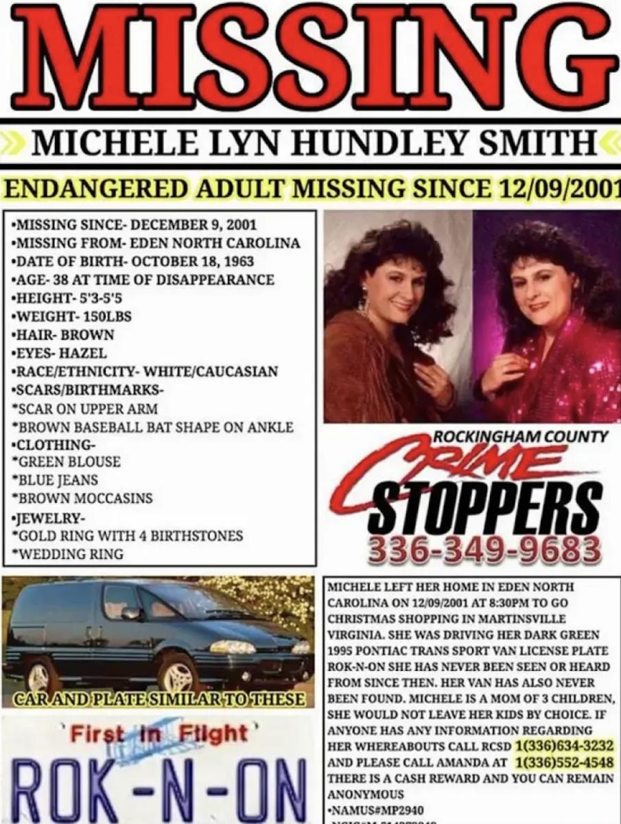 Μια μητέρα τριών παιδιών, η οποία είχε εξαφανιστεί πριν από περισσότερες από δύο δεκαετίες, εντοπίστηκε «ζωντανή και καλά», σύμφωνα με ανακοίνωση των Αρχών. Η Michele Hundley Smith είχε χαθεί τον Δεκέμβριο του 2001, όταν έφυγε από το σπίτι της στο Eden της Βόρειας Καρολίνας για να κάνει χριστουγεννιάτικα ψώνια στην Βιρτζίνια. Ήταν 38 ετών όταν, στις 9 Δεκεμβρίου 2001, έφυγε για τα ψώνια της και δεν επέστρεψε ποτέ.