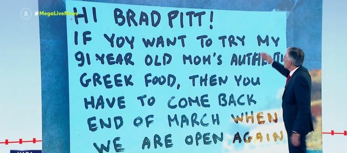 Ένας ιδιοκτήτης ταβέρνας στο νησί, θέλοντας να προσελκύσει τον διάσημο ηθοποιό με τον πιο άμεσο και ειλικρινή τρόπο, σκέφτηκε κάτι που μόνο ένας Έλληνας θα μπορούσε να σκαρφιστεί. Αντί για επίσημες προσκλήσεις και κόκκινα χαλιά, άφησε ένα χειρόγραφο σημείωμα που έγινε αμέσως viral. Στο μήνυμά του, απευθύνεται στον Μπραντ με οικειότητα, ενημερώνοντάς τον πως αν πραγματικά θέλει να γευτεί το αυθεντικό ελληνικό φαγητό της 91χρονης μητέρας του, θα πρέπει να κάνει λίγη υπομονή. «Έλα πίσω στα τέλη Μαρτίου, όταν θα είμαστε πάλι ανοιχτά», έγραφε το σημείωμα, κλείνοντας με έναν τρόπο που συνδυάζει την επαγγελματική υπερηφάνεια με την οικογενειακή παράδοση.