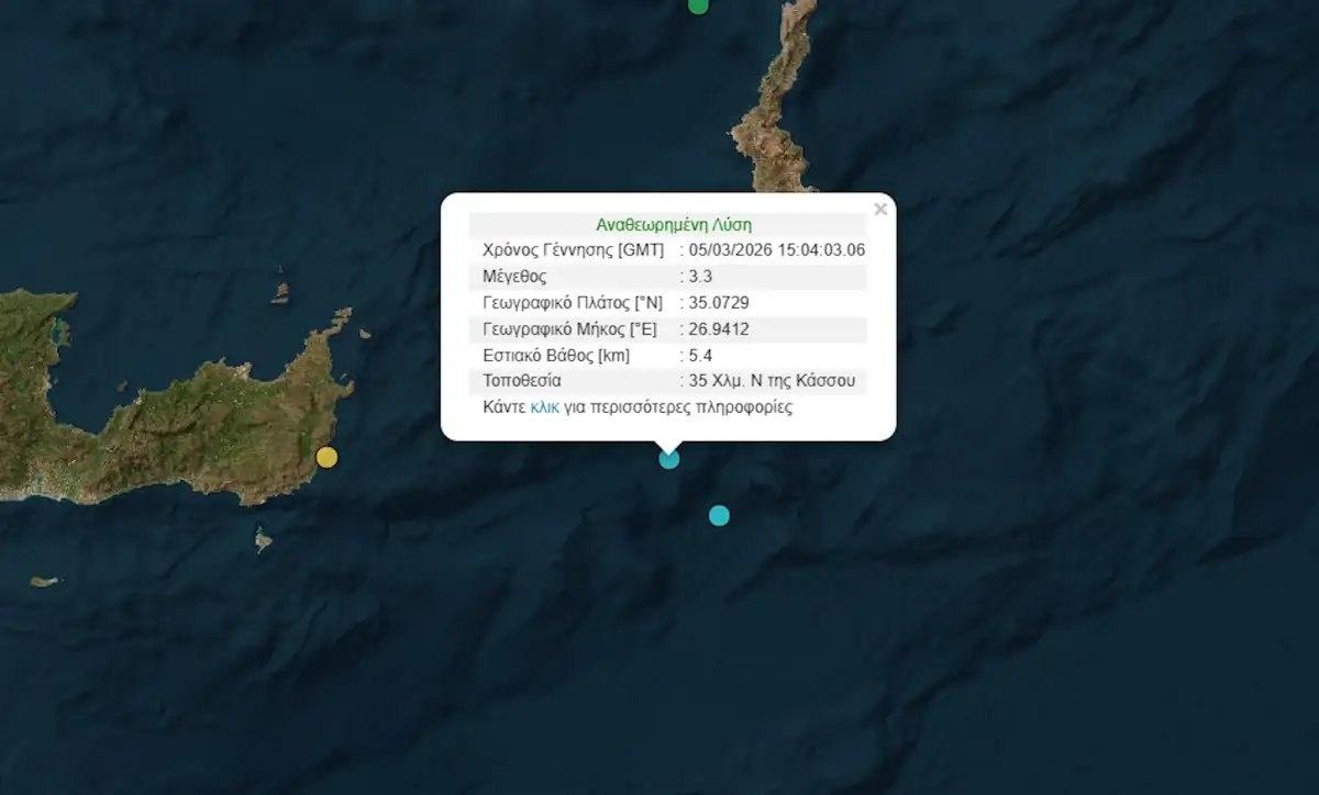 Σεισμός μεγέθους 3,3 βαθμών της κλίμακας Ρίχτερ κατεγράφη το απόγευμα της Πέμπτης, 5 Μαρτίου 2026, στις 17:04, στον θαλάσσιο χώρο μεταξύ Κρήτης και Κάσου. Με βάση την επίσημη ανακοίνωση του Γεωδυναμικού Ινστιτούτου του Εθνικού Αστεροσκοπείου Αθηνών, το επίκεντρο του σεισμού εντοπίζεται 35 χιλιόμετρα νότια της Κάσου και ανατολικά του νομού Λασιθίου.