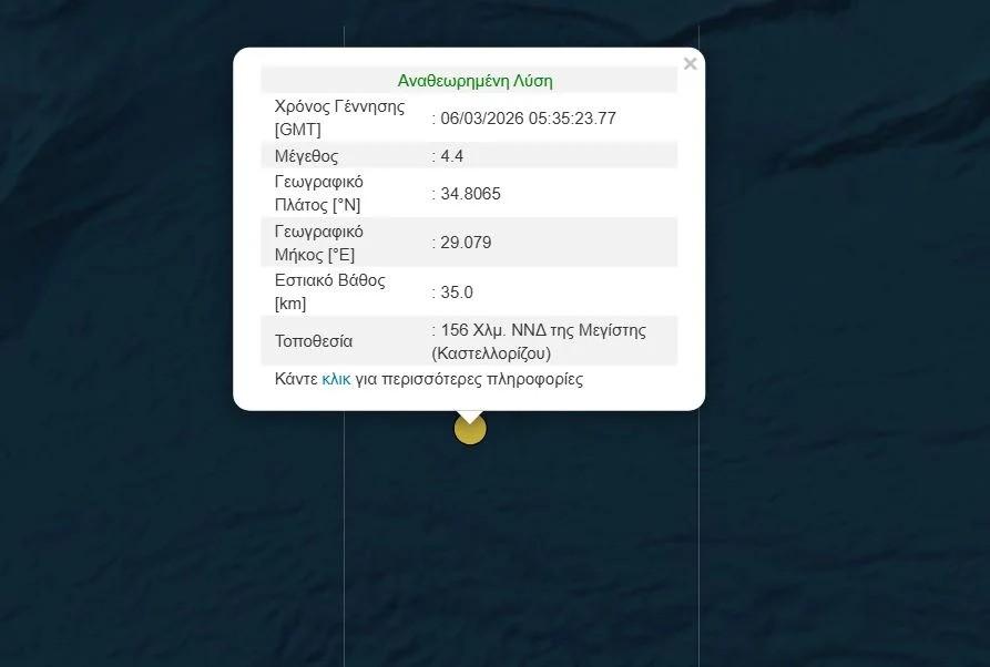 Σεισμός 4,4 βαθμών της κλίμακας Ρίχτερ σημειώθηκε στις 07:35 το πρωί της Παρασκευής (06/03), σε απόσταση 595 χλμ. νοτιοανατολικά της Αθήνας.