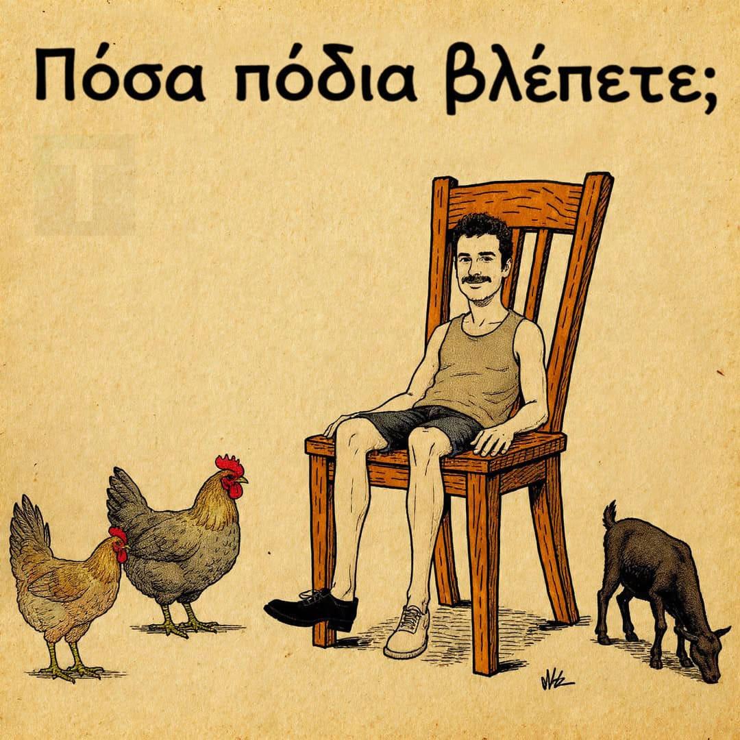 Στην εικόνα βλέπουμε έναν άντρα που κάθεται πάνω σε μια καρέκλα. Ο άντρας φυσικά έχει 2 πόδια. Δίπλα του βρίσκονται δύο κότες, και κάθε κότα έχει 2 πόδια, άρα οι κότες μαζί έχουν 4 πόδια.