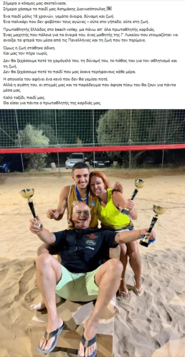 Ο πατέρας αναφέρει πως «σήμερα ο κόσμος σκοτείνιασε» σημειώνοντας πως ο γιος του ήταν γεμάτος όνειρα, δύναμη και ζωή. Σύμφωνα με τον ίδιο, ήταν «πρωταθλητής Ελλάδος στο beach volley, μα πάνω απ’ όλα πρωταθλητής καρδιάς».