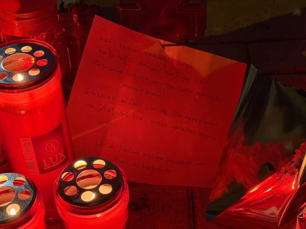 Κεριά, λουλούδια και μηνύματα μνήμης έχουν τοποθετηθεί εκεί, δημιουργώντας μια σιωπηλή εικόνα πένθους για τον άδικο χαμό του.
