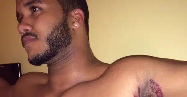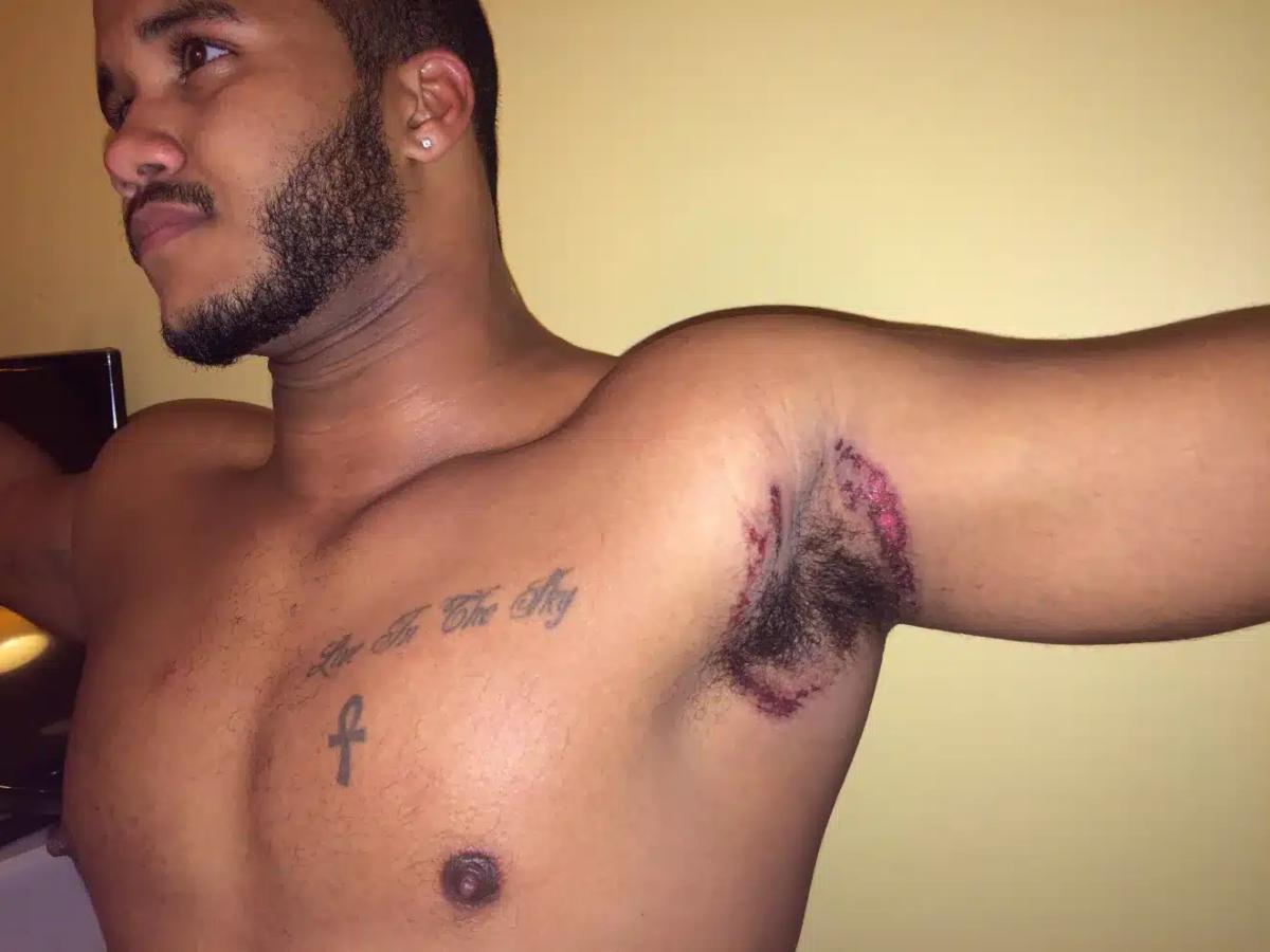 Ο Rodney Colley, φοιτητής από την Αλεξάνδρεια της Βιρτζίνια, διαπίστωσε ένα εξάνθημα στη μασχάλη του, το οποίο αρχικά δεν του προκάλεσε ανησυχία. Ωστόσο, η κατάσταση επιδεινώθηκε γρήγορα, συνοδευόμενη από έντονο πόνο. Όπως περιγράφει: «Την επόμενη μέρα που ξύπνησα ένιωσα ότι η μασχάλη μου είχε πάρει φωτιά. Κοίταξα στον καθρέφτη και το εξάνθημα είχε χειροτερέψει.» Στη συνέχεια, αποδόθηκε η αιτία στη χρήση ενός νέου αποσμητικού, το οποίο φέρεται να προκάλεσε χημικό ερεθισμό ή εγκαύματα στην περιοχή.