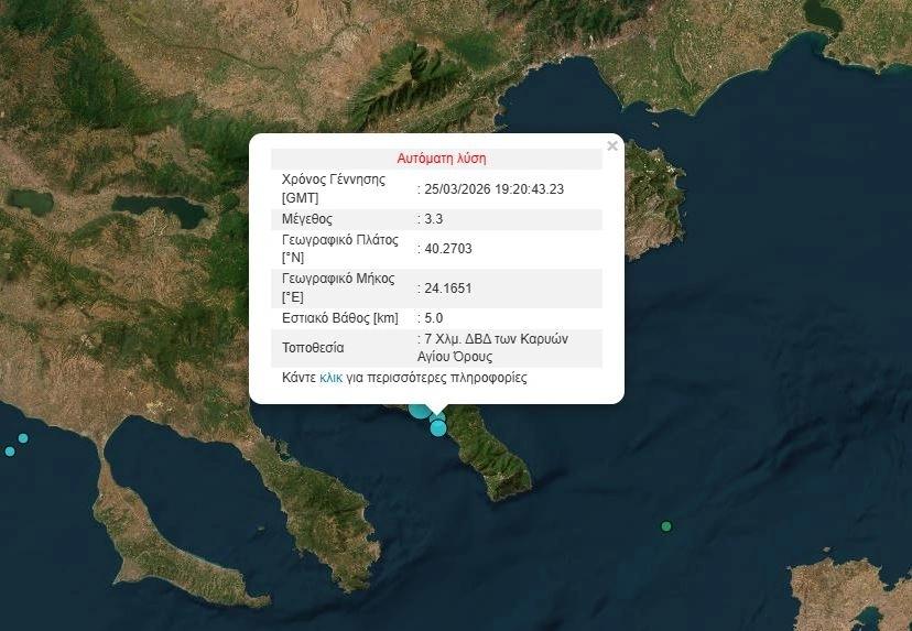 Ισχυρή σεισμική δόνηση καταγράφηκε το βράδυ της 25ης Μαρτίου στην περιοχή του Αγίου Όρους, προκαλώντας αισθητή αναστάτωση σε πολλές περιοχές της βόρειας Ελλάδας. Το φαινόμενο συνοδεύτηκε από μετασεισμική δραστηριότητα, η οποία ενίσχυσε την ανησυχία των κατοίκων.