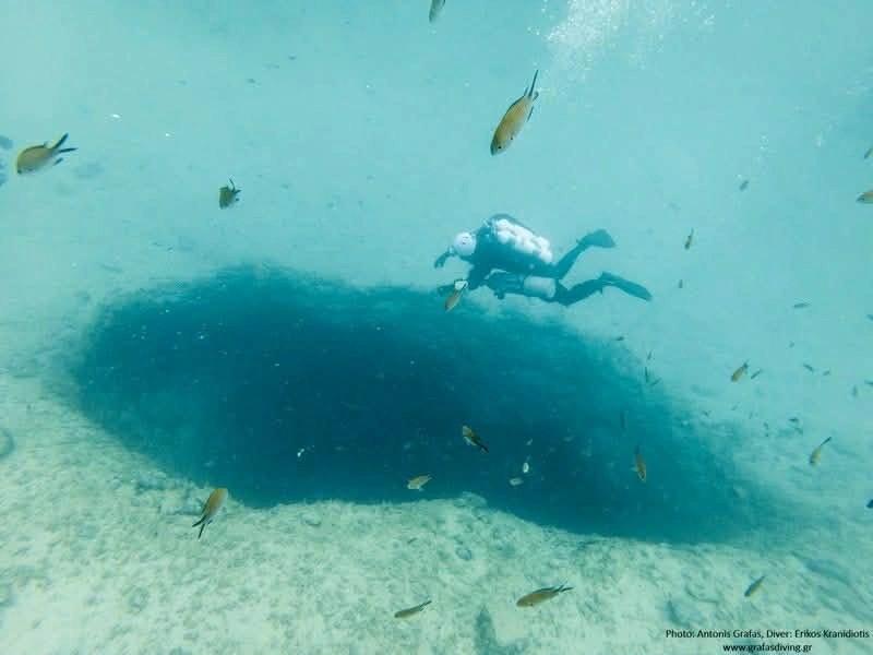 Το σημείο όπου έγινε η κατάδυση μοιάζει με ένα υποθαλάσσιο πηγάδι. Η είσοδός του βρίσκεται λίγα μέτρα από τα βράχια και φτάνει κάθετα μέχρι και τα 30 μέτρα.