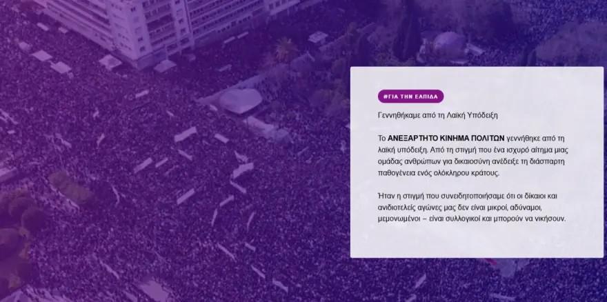 «Είμαστε ένα ΑΝΕΞΑΡΤΗΤΟ ΚΙΝΗΜΑ ΠΟΛΙΤΩΝ που γεννιέται από τη βάση, από την κοινή μας ανάγκη να έρθει επιτέλους η αλλαγή. Όλοι εμείς Είμαστε άνθρωποι με διαφορετικές καταβολές, με ποικίλες διαδρομές, κινηματικές ή όχι, κάθε ηλικίας και εμπειρίας. Δεν μας χωράει μια ταμπέλα. Μας ενώνει ένα κοινό όραμα: ότι ΑΞΙΖΟΥΜΕ ΜΙΑ ΚΑΛΥΤΕΡΗ ΧΩΡΑ. Και μια κοινή ανάγκη: ΝA ΑΝΤΙΜΕΤΩΠΙΣΟΥΜΕ ΤΙΣ ΥΠΑΡΞΙΑΚΕΣ ΑΠΕΙΛΕΣ για την κοινωνία και την πατρίδα μας. Κουβαλάμε μέσα μας ιστορίες διαφορετικές, αλλά κοινά όνειρα και μεγάλη δυσπιστία σε όσους οδήγησαν τη χώρα στα σημερινά πολλαπλά αδιέξοδα. Είμαστε γυναίκες και άνδρες, χωρίς διαχωρισμούς και διακρίσεις, σπουδαστές, φοιτητές, άνεργοι ή εργαζόμενοι, στη γη, σε εργοστάσιο, εργαστήριο, σκηνή ή γραφείο, υπάλληλοι, επαγγελματίες και επιχειρηματίες, επιστήμονες και καλλιτέχνες, νέοι και μεγαλύτεροι σε ηλικία, που ονειρεύονται και δημιουργούν καθημερινά ένα καλύτερο ΚΟΙΝΟ ΑΥΡΙΟ. Είμαστε άνθρωποι που βλέπουμε την αδικία και δεν γυρίζουμε το κεφάλι αλλού, που αισθανόμαστε καλύτερα δείχνοντας αλληλεγγύη στον συνάνθρωπο, κάθε φορά, που κάποιος σκοντάφτει ή δυσκολεύεται να ακολουθήσει».