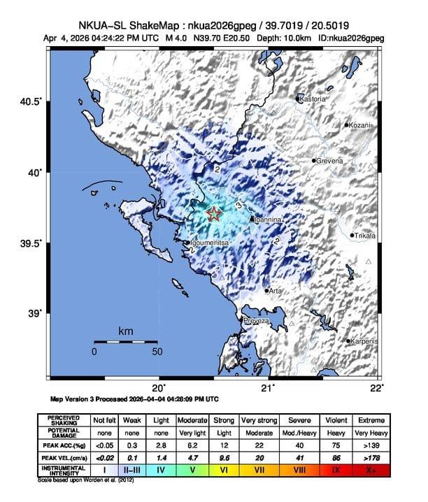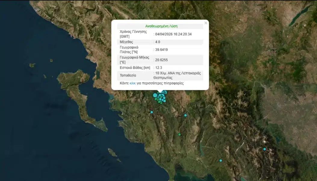 Σεισμός μεγέθους 4 Ρίχτερ σημειώθηκε στις 19:24 το απόγευμα του Σαββάτου (4/4) στην περιοχή της Θεσπρωτίας, προκαλώντας ανησυχία στους κατοίκους της ευρύτερης περιοχής, χωρίς ωστόσο να έχουν αναφερθεί μέχρι στιγμής σοβαρές ζημιές ή τραυματισμοί.