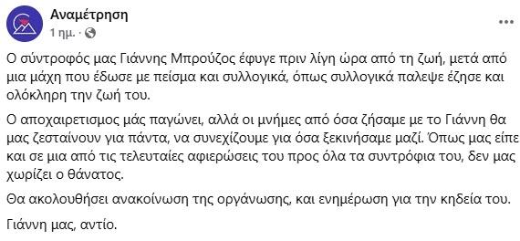 Την είδηση του θανάτου του έκανε γνωστή με μία ανάρτηση στο Facebook η οργάνωση «Αναμέτρηση».